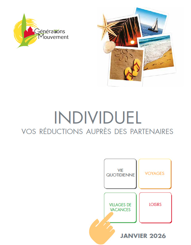 Réductions De nombreux partenariats ont été développés dans le secteur du tourisme mais aussi de la santé, des loisirs et de la vie quotidienne. Découvrez tous nos partenaires sur generations-mouvement.org. Réductions individuelles Téléchargez le document « Réductions individuelles« Mise à jour janvier 2026Pour les Gîtes de France, se reporter à la procédure ci-dessous. Procédure « Gîtes de France » Téléchargez le document « Gîtes de France« Procédure « Maeva – Center Parcs – Pierre et Vacances – Adagio » Téléchargez le document « Maeva – Center Parcs – Pierre et Vacances – Adagio« Réductions de groupes Téléchargez le document « Réductions de groupes« Mise à jour janvier 2026 Avantages Sacem Pour les associations adhérentes à Générations Mouvement, un accord de partenariat a été signé avec la SACEM offrant une réduction de 12,5 %.Bénéficiez de 20% de remise en déclarant votre évènement avant son déroulement.Ces deux réductions peuvent s’additionner !Droits de diffusion-Tarifs Accord Sacem-Générations Mouvement